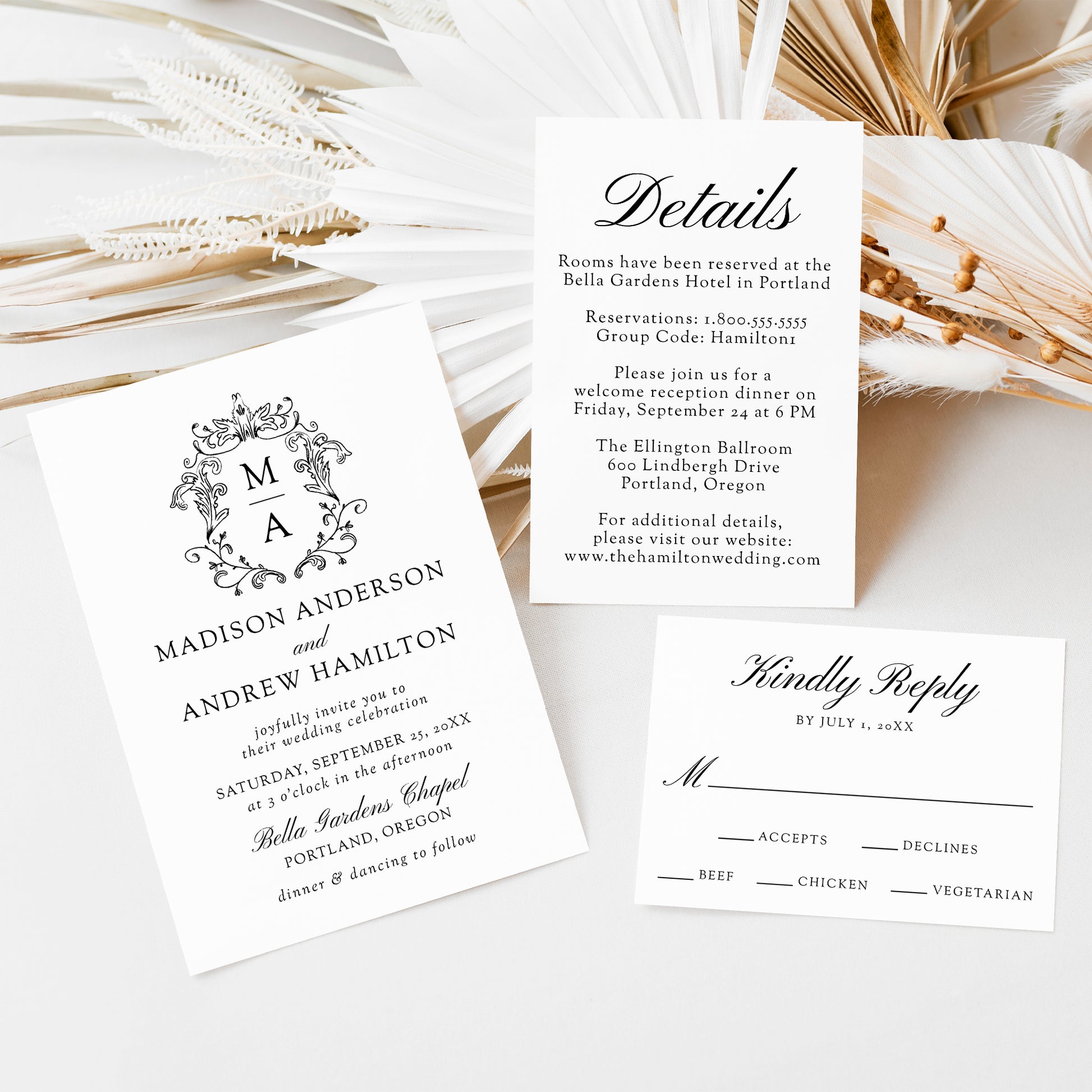 Celebrate your special day with timeless elegance using this Elegant Black Chinoiserie Wedding Suite. This printable stationery set features a beautifully detailed chinoiserie-inspired crest in classic black, paired with refined floral accents and traditional serif typography. Whether you're planning a formal black-tie wedding, a romantic evening affair, or an elegant estate celebration, this versatile suite sets the tone for a sophisticated and memorable event. Designed for easy editing with Corjl, you can personalize the entire set right in your browser—no software required.