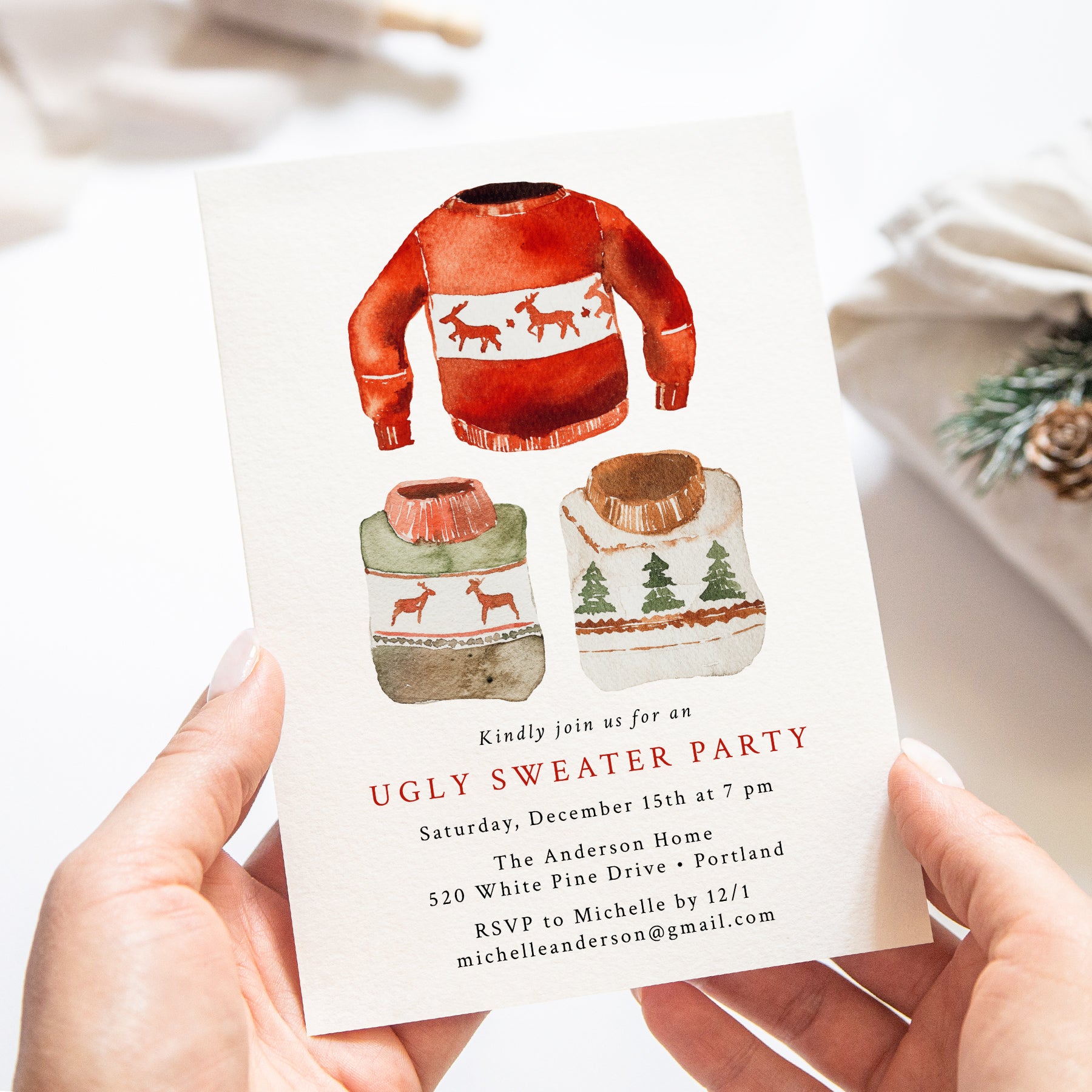 Watercolor Ugly Sweater Holiday Party Invitation | Corjl Template