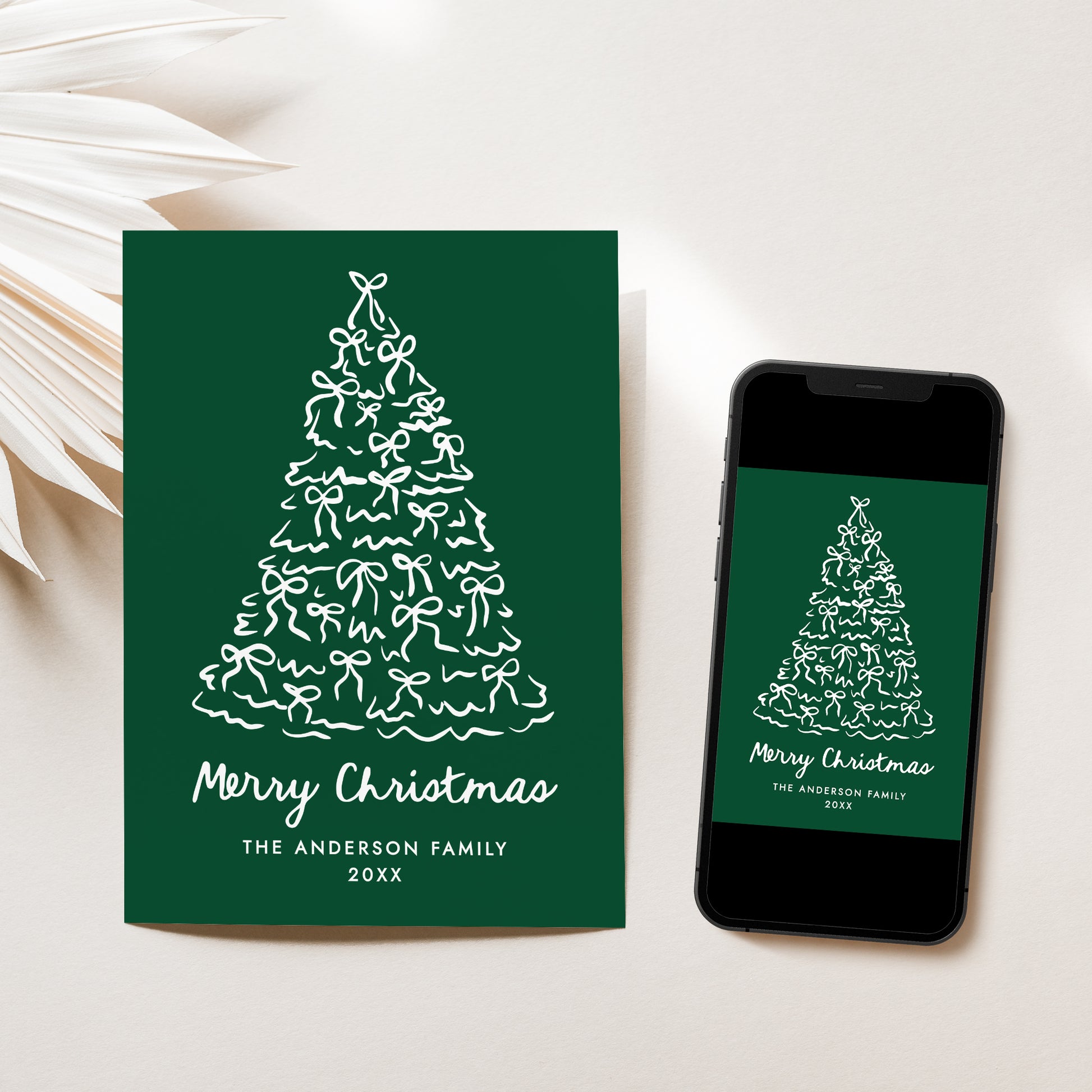 Share holiday cheer with this whimsical hand-drawn non-photo Christmas card template. The design features a deep evergreen background with a charming white Christmas tree decorated with playful bows for a modern and festive look. “Merry Christmas” is displayed in cheerful handwritten script, with space underneath to personalize your family name and year. The back includes room for your custom holiday message, making this green and white design a stylish way to send heartfelt greetings to loved ones.
