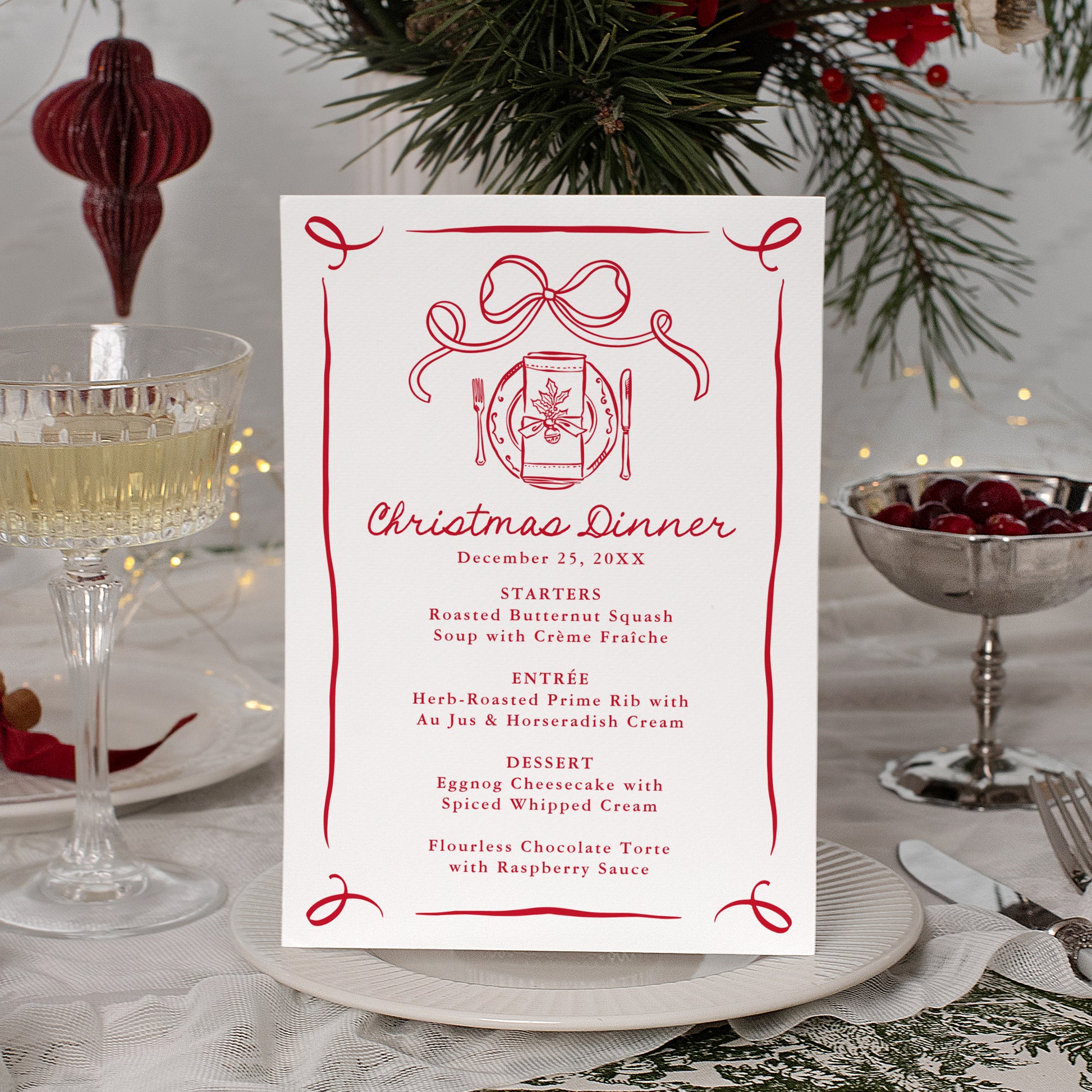 Complete your holiday table with this hand-drawn red Christmas dinner menu template. The design features charming red illustrations and lettering on a crisp white background, accented by a ribbon bow at the top. Below, a festive dinner plate and silverware illustration add a classic holiday touch. “Christmas Dinner” is displayed in a handwritten red script with space underneath for your custom menu items and date. A flowing red ribbon border frames the layout, creating an elegant, cohesive design that pairs beautifully with matching invitations from the same collection.